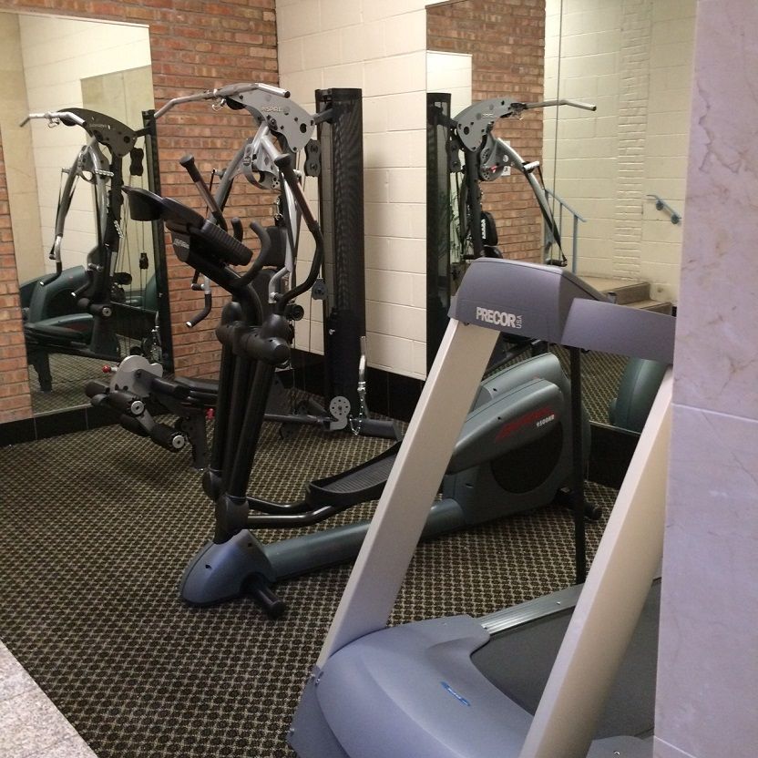 The building lobby is welcoming with its marble and exposed brick.