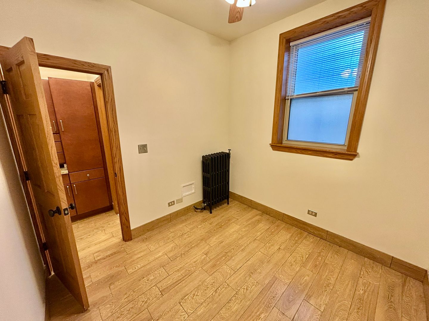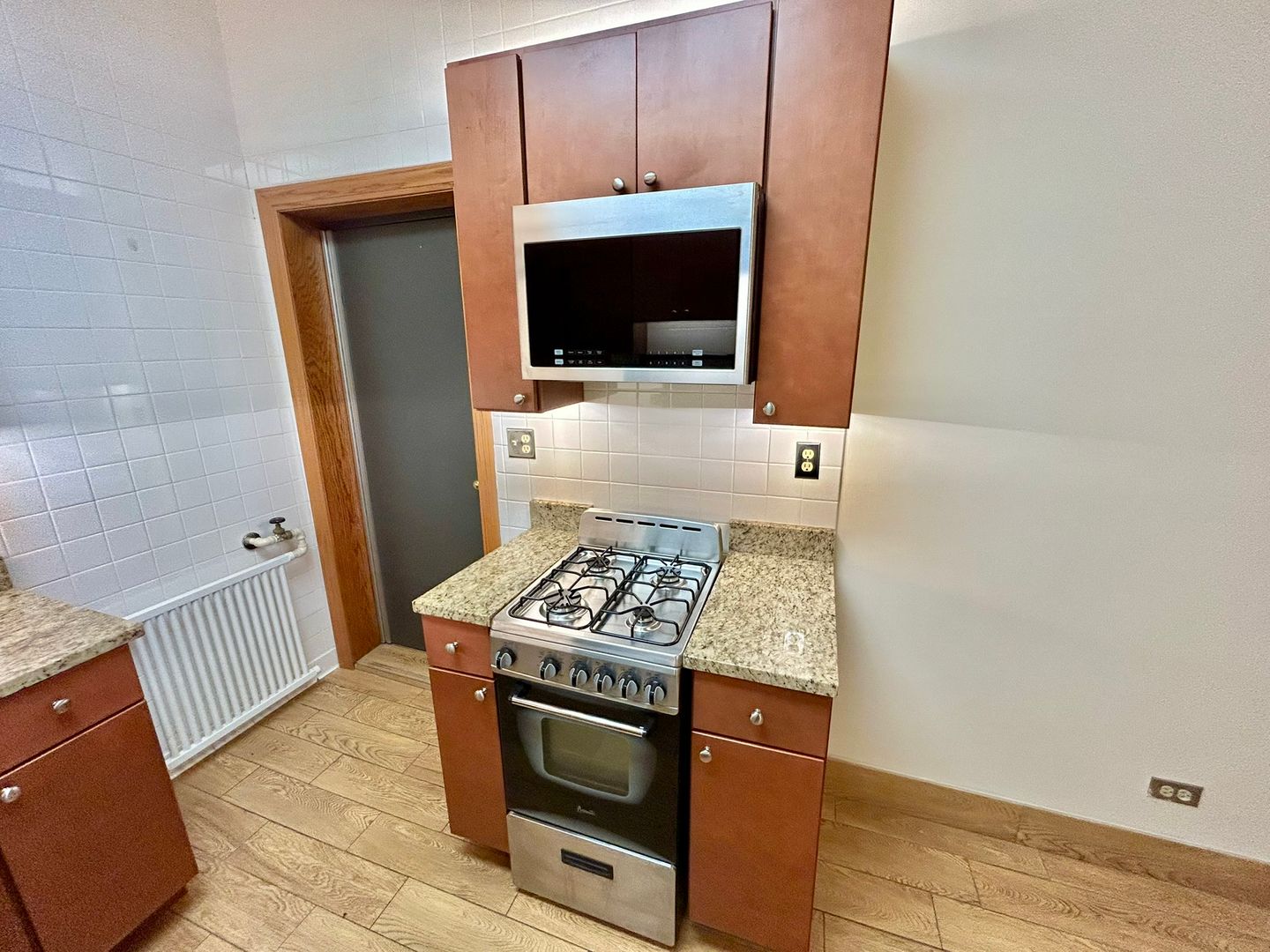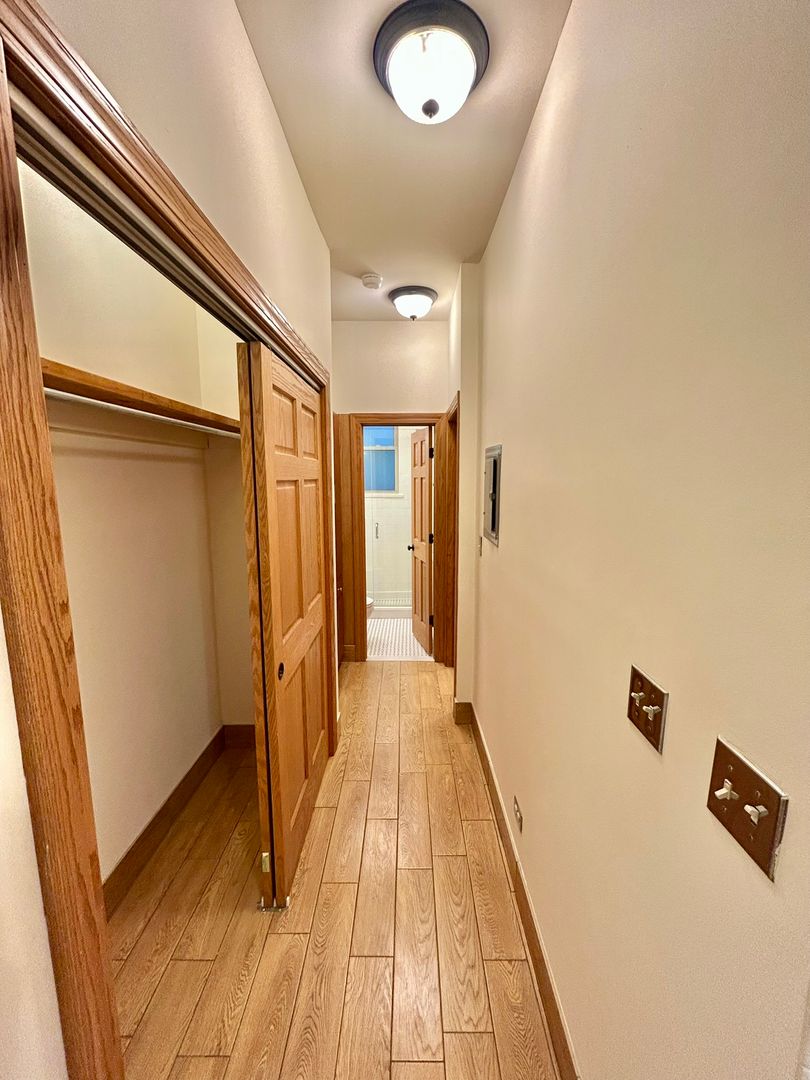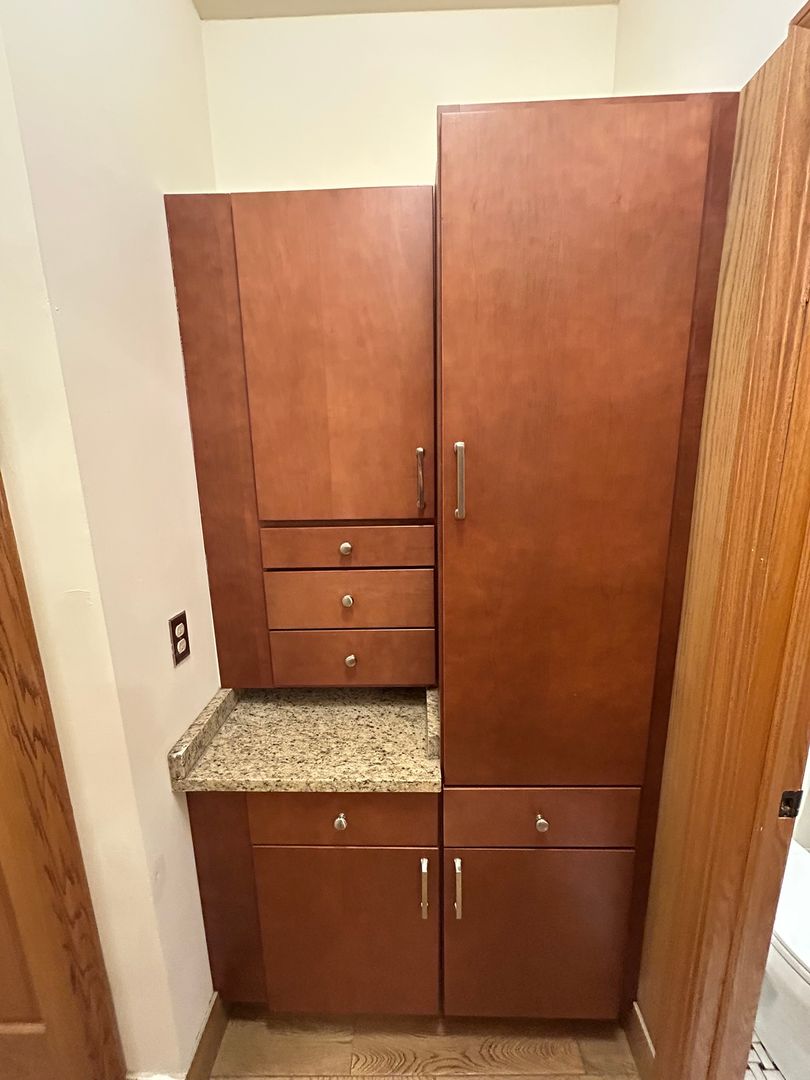 New custom cabinets in the kitchen and linen storage near the bathroom