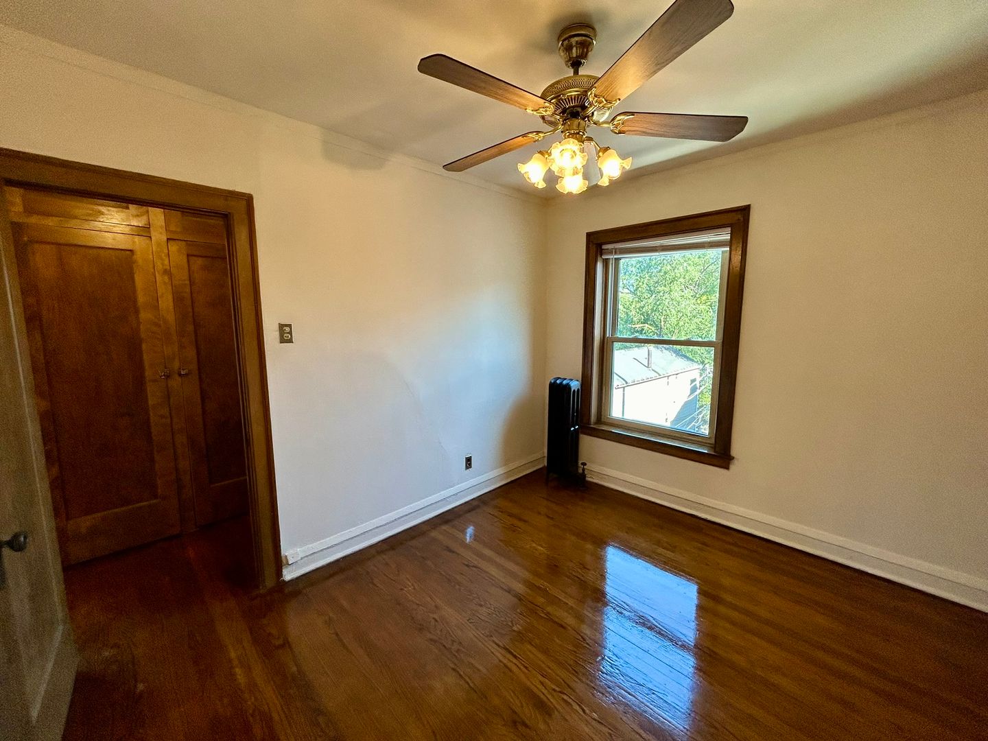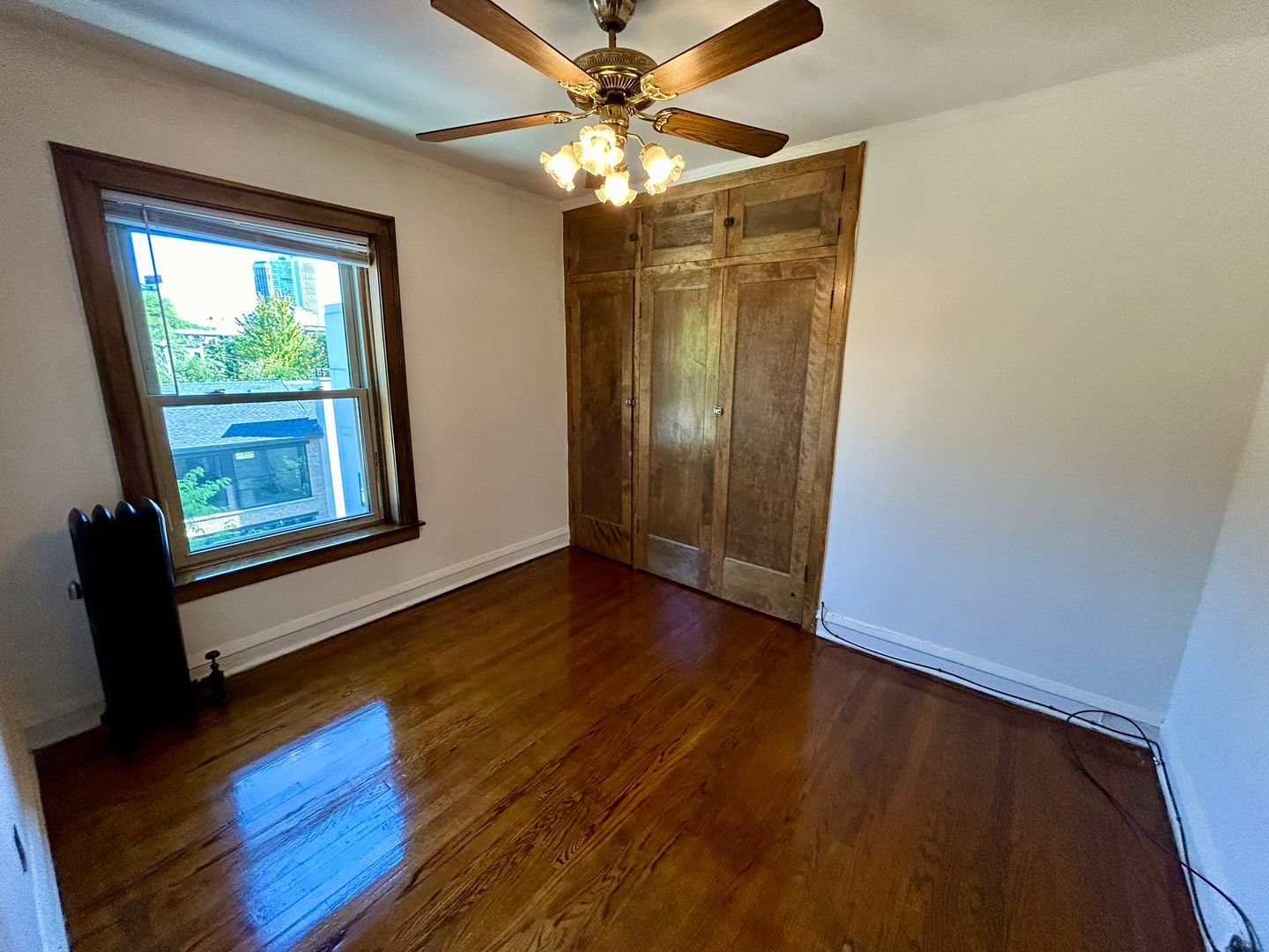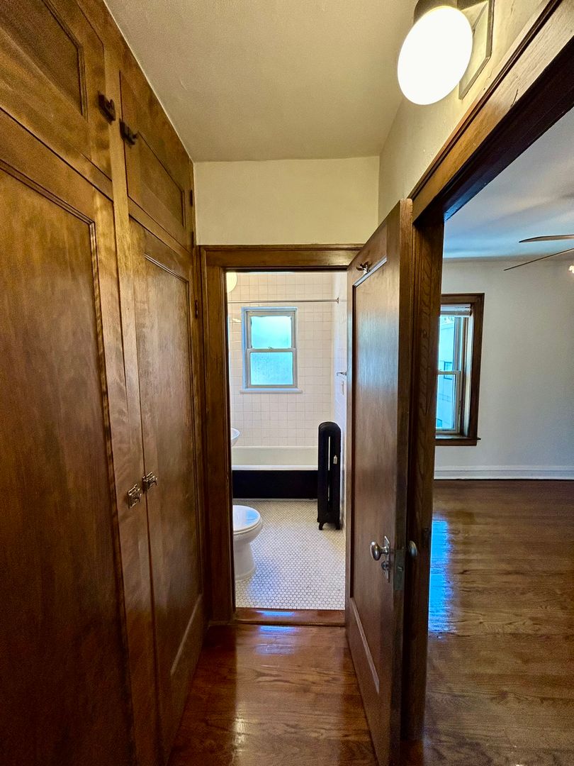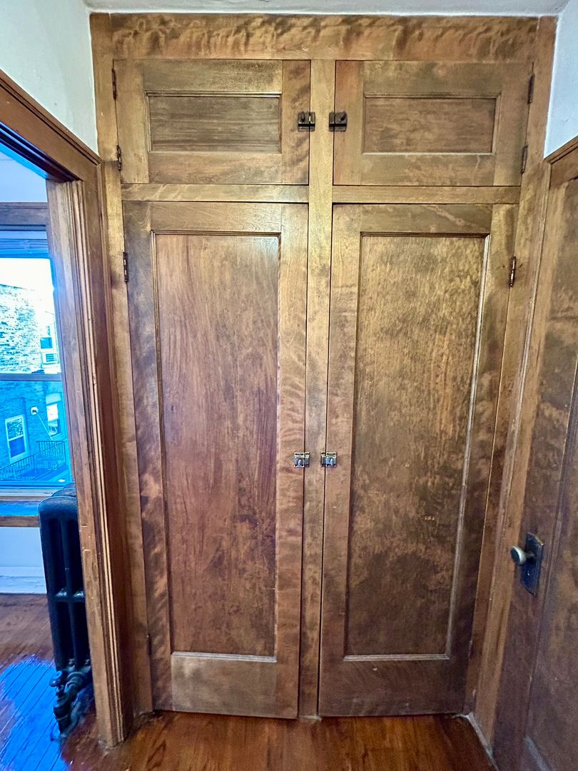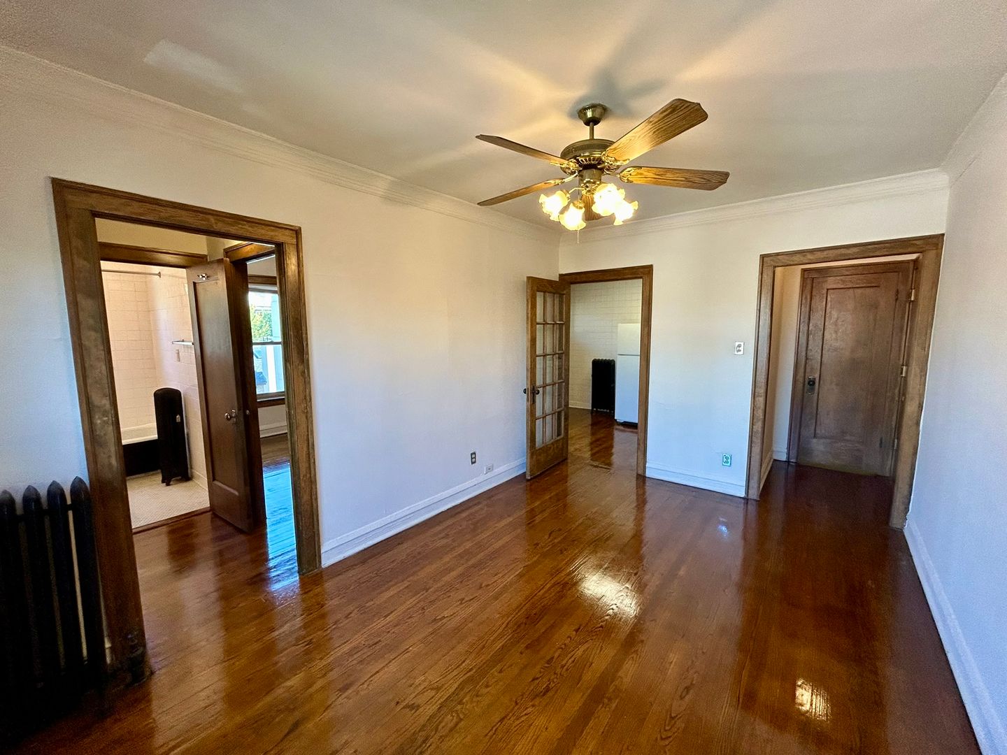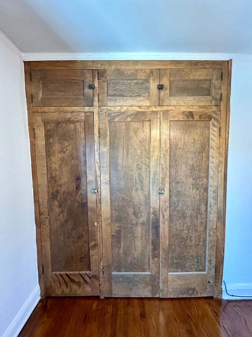 Spacious vintage one bedroom is rich with natural wood finishes